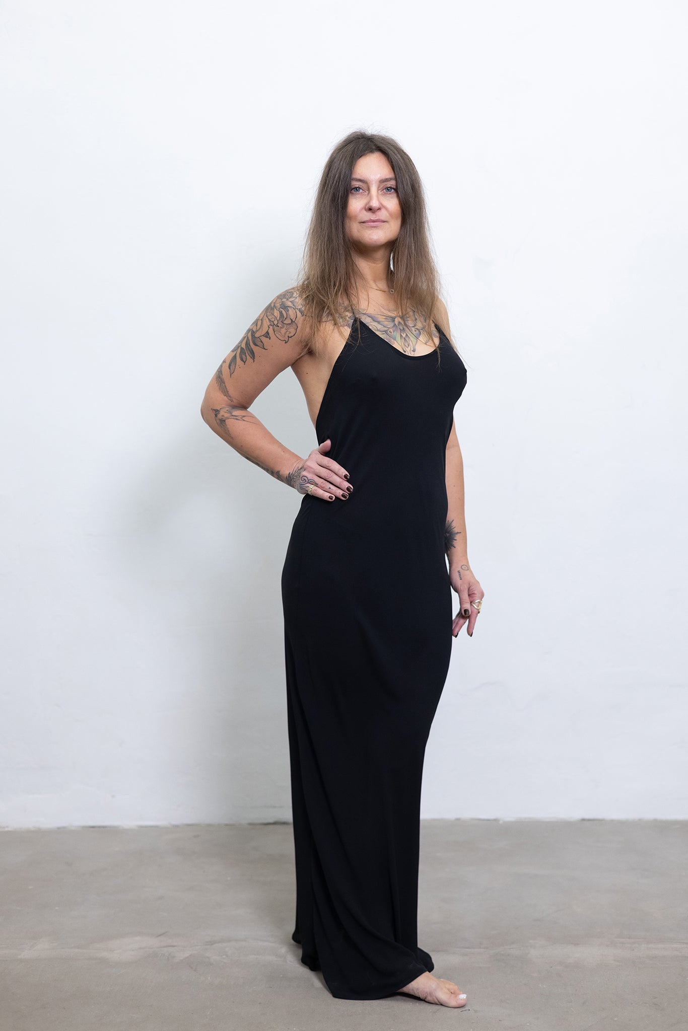 The Essence Slip Dress is crafted for the woman who embodies subtle elegance. Cut on the bias, it gently follows the curves of your body, creating a smooth, close-fitting silhouette that feels natural, confident, and effortlessly feminine. The matte fabric softens the light, giving the dress a refined, modern look — minimal, grounded, and beautifully understated. Its open back adds a touch of sensuality, balancing purity of form with a quiet allure. Lightweight and versatile, it transitions seamlessly from day to evening: paired with flats for a simple daytime look or elevated with heels for a sleek, nighttime presence. Timeless, easy to style, and designed to move with you, this slip dress becomes an essential part of a minimalist wardrobe. A piece that embraces your shape, honors your femininity, and lets simplicity speak for itself.